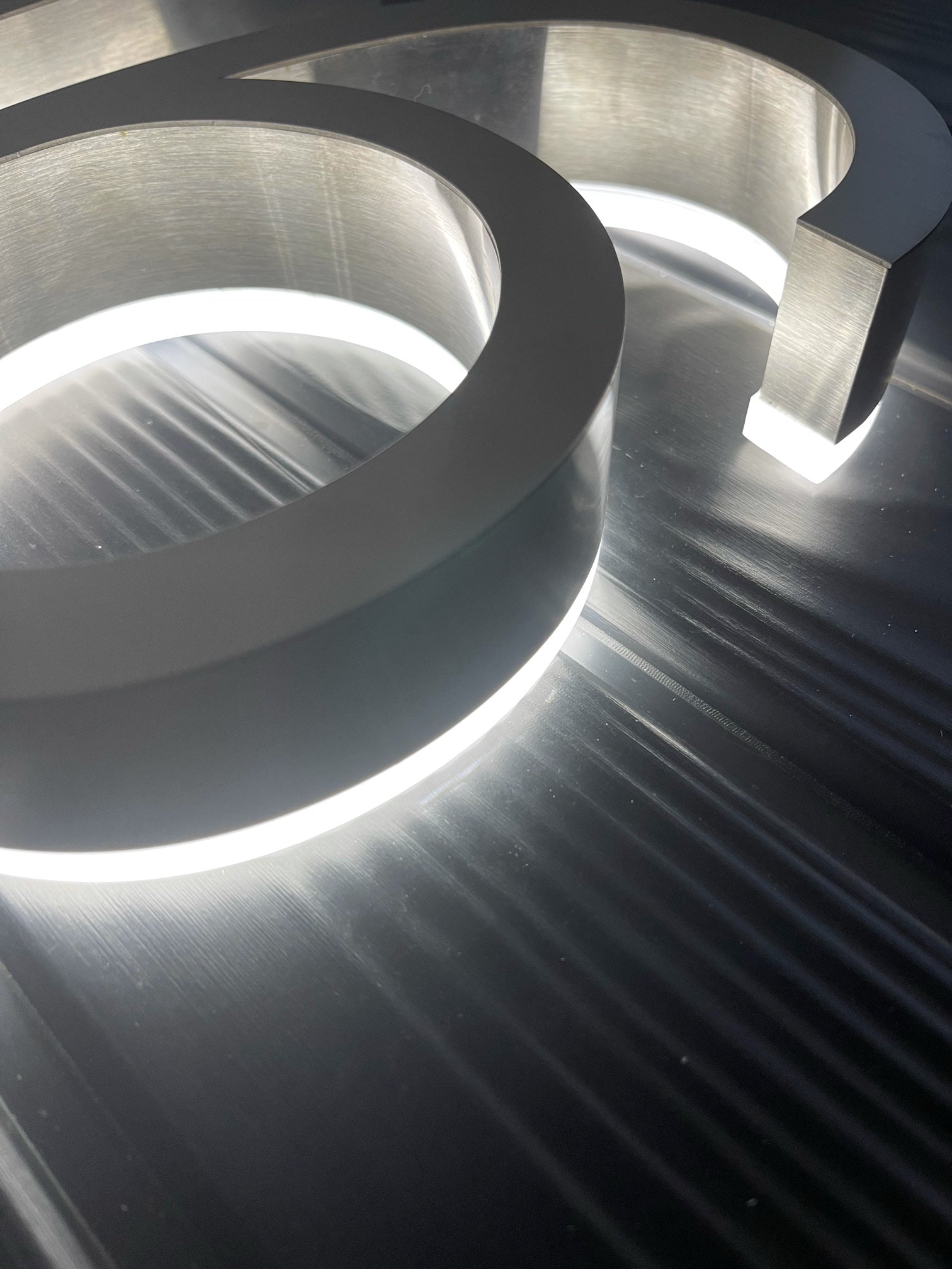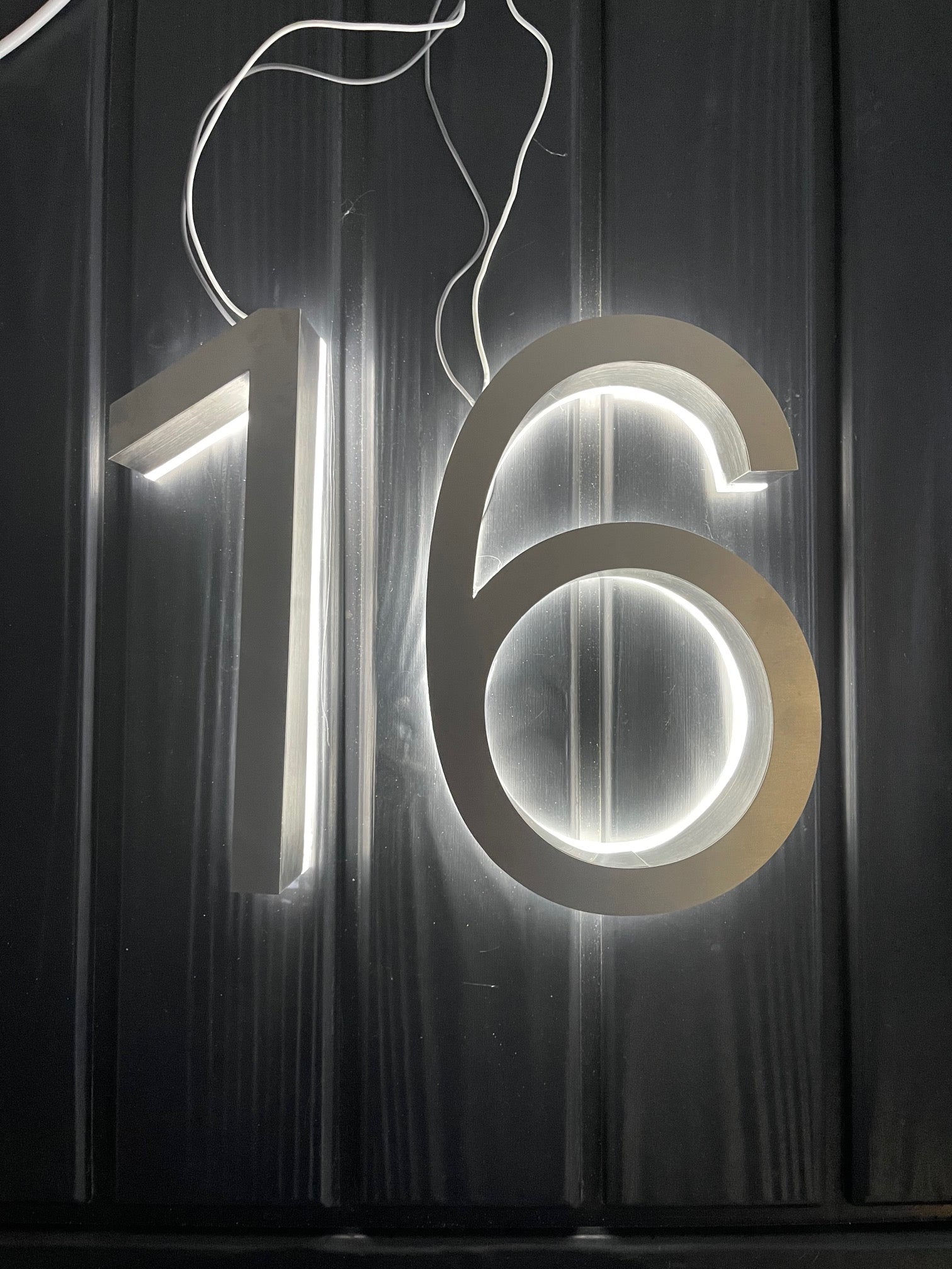 Numero tehty harjatetusta teräksestä, sillä on ledit jo valmiiksi asennettuna ja akryylipohja. Tässä on valkoinen väri, 6500K. Kirkas taustavalo takaa näkyvyyden. Valo tulee sivusuunnasta numeron akryylireunan läpi.